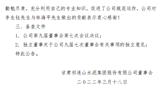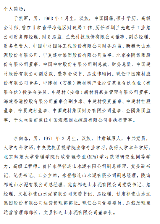 同時發(fā)布的《關(guān)于更換董事及調(diào)整高級管理人員的公告》稱,公司非獨(dú)立董事李生鈺先生因工作調(diào)整不再擔(dān)任公司董事及董事會戰(zhàn)略委員會委員職務(wù),根據(jù)公司股東中國建材股份有限公司推薦意見,公司第九屆董事會提名委員會提名于凱軍先生為公司第九屆董事會非獨(dú)立董事候選人。公司副總裁李生鈺先生、林海平先生因工作調(diào)整,不再擔(dān)任公司副總裁一職。根據(jù)公司股東中國建材股份有限公司推薦意見,經(jīng)總裁提名,擬聘任李向春先生為公司副總裁。