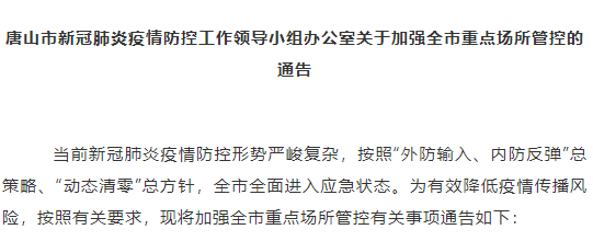 同日,唐山市新冠肺火防控工作領(lǐng)導(dǎo)小組辦公室發(fā)布加強(qiáng)全市重點(diǎn)場(chǎng)所管控的通告,對(duì)全市實(shí)施疫情防控臨時(shí)性交通管制。