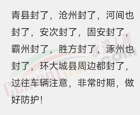 與唐山相鄰廊坊及天津早在19日前就通知執(zhí)行嚴(yán)格管控,有網(wǎng)友發(fā)消息提示過(guò)往車(chē)輛:青縣、滄州、河間、安次、固安、霸州、勝方、涿州等環(huán)大城縣周邊實(shí)施封控措施。