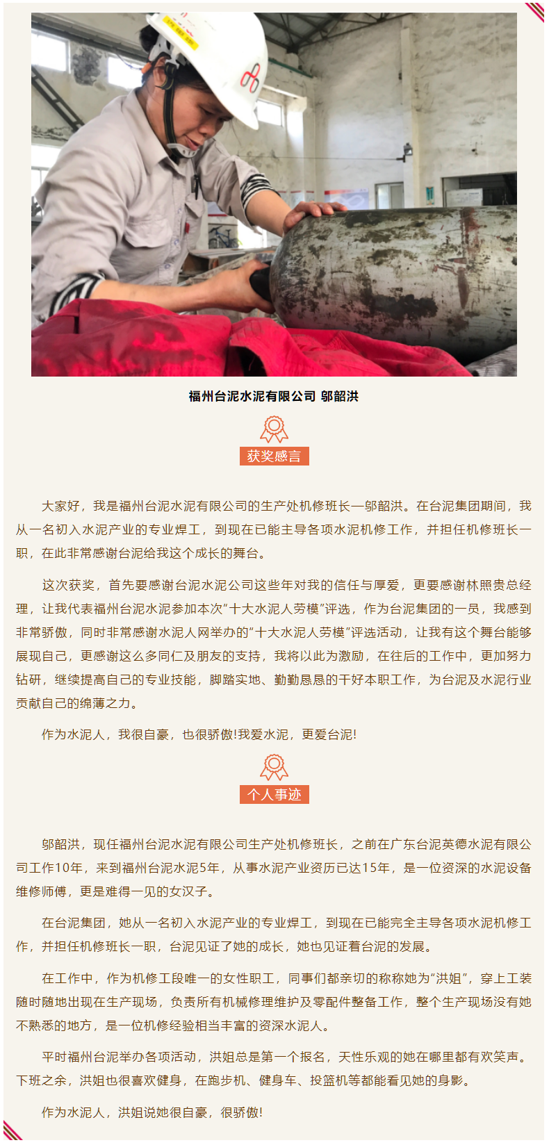 洪姐還曾在廣東臺泥英德水泥有限公司工作10年,是一位水泥設(shè)備維修資深師傅,更是難得一見的女漢子。臺泥見證了她的成長,她也見證著臺泥的發(fā)展。作為水泥人,洪姐說她很自豪,很驕傲!