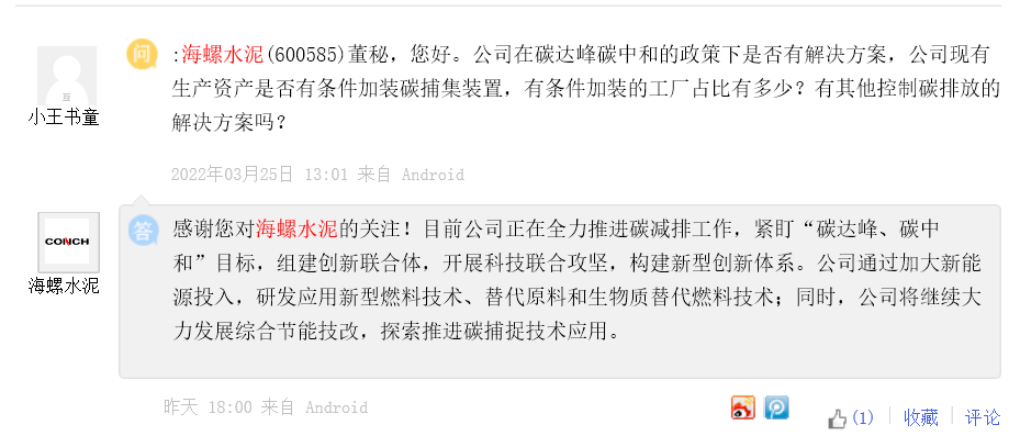 海螺水泥表示,目前公司正在全力推進(jìn)碳減排工作,緊盯“碳達(dá)峰、碳中和”目標(biāo),組建創(chuàng)新聯(lián)合體,開(kāi)展科技聯(lián)合攻堅(jiān),構(gòu)建新型創(chuàng)新體系。公司通過(guò)加大新能源投入,研發(fā)應(yīng)用新型燃料技術(shù)、替代原料和生物質(zhì)替代燃料技術(shù);同時(shí),公司將繼續(xù)大力發(fā)展綜合節(jié)能技改,探索推進(jìn)碳捕捉技術(shù)應(yīng)用。