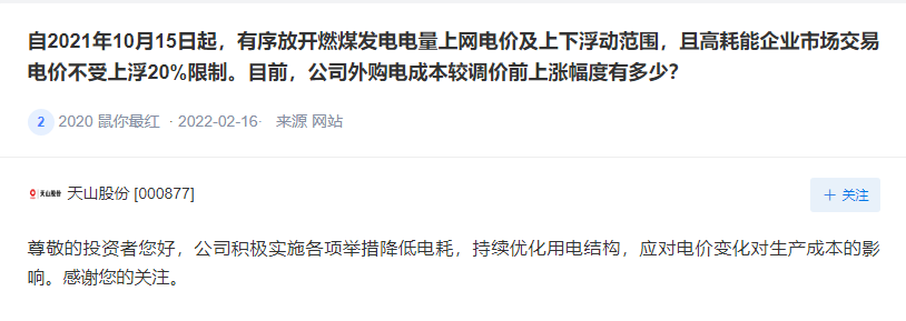 在應(yīng)對(duì)需求減少,成本增加方面,天山股份表示,2022年,中央經(jīng)濟(jì)工作會(huì)議穩(wěn)增長(zhǎng)基調(diào)托底,預(yù)計(jì)經(jīng)濟(jì)將保持平穩(wěn)增長(zhǎng)。對(duì)水泥需求產(chǎn)生積極影響的因素主要來(lái)自于國(guó)家重點(diǎn)工程等基建項(xiàng)目,水泥行業(yè)產(chǎn)能過(guò)剩局面未改變,不同區(qū)域價(jià)格不同,價(jià)格變化與供求關(guān)系緊密相關(guān),成本端面臨上漲壓力,公司力爭(zhēng)消化原燃材料成本變化對(duì)經(jīng)營(yíng)的影響。針對(duì)電價(jià)上漲將積極實(shí)施各項(xiàng)舉措降低電耗,持續(xù)優(yōu)化用電結(jié)構(gòu),應(yīng)對(duì)電價(jià)變化對(duì)生產(chǎn)成本的影響。