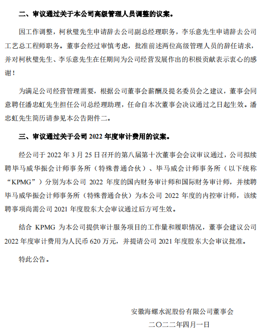 3月18日祁連山水泥發(fā)布《關(guān)于更換董事及調(diào)整高級管理人員的公告》稱:公司非獨立董事李生鈺先生因工作調(diào)整不再擔(dān)任公司董事及董事會戰(zhàn)略委員會委員職務(wù),同時提名于凱軍先生為公司第九屆董事會非獨立董事候選人;公司副總裁李生鈺先生、林海平先生因工作調(diào)整,不再擔(dān)任公司副總裁一職,擬聘任李向春先生為公司副總裁。