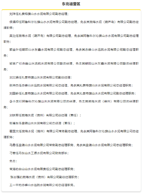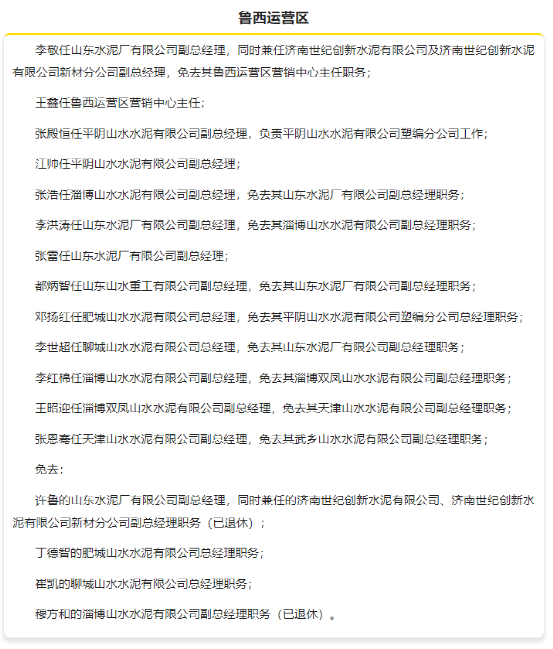 1月中旬,山東山水集團有限公司發(fā)布人事任命,對旗下多個運營區(qū)進行人事調(diào)整,涉及魯西、魯東、魯南、東北和山西等多個區(qū)域。