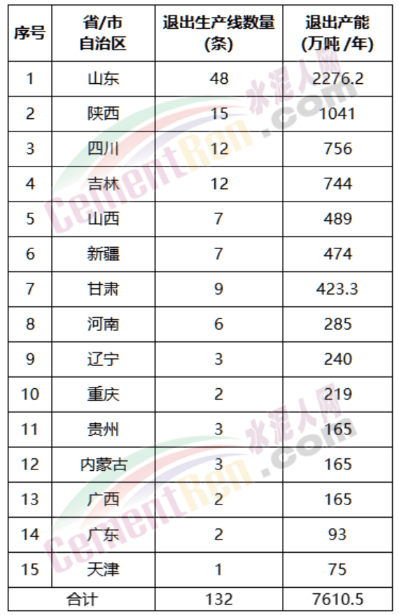 據(jù)各地工信廳2022年以來公示公告消息以及各區(qū)域截止2021年底公示產(chǎn)能清單數(shù)據(jù),山東、陜西、甘肅、貴州、四川、重慶、天津、山西、內(nèi)蒙古、新疆、遼寧、吉林、河南、廣東、廣西等15個(gè)省市自治區(qū)明確拆除、擬拆除退出132條熟料生產(chǎn)線,合計(jì)退出產(chǎn)能達(dá)7610.5萬噸/年。