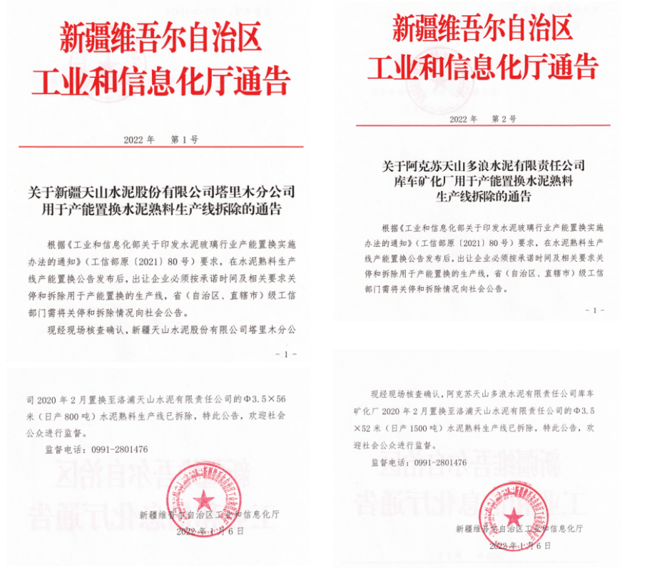 新疆自治區(qū)工信廳1月6日公告,天山水泥兩條熟料生產(chǎn)線合計(jì)2300t/d產(chǎn)能已拆除退出。