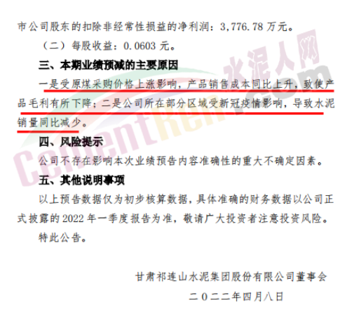 業(yè)績(jī)變動(dòng)主要原因是:一是受原煤采購價(jià)格上漲影響,產(chǎn)品銷售成本同比上升,致使產(chǎn)品毛利有所下降;二是公司所在部分區(qū)域受新冠疫情影響,導(dǎo)致水泥銷量同比減少。