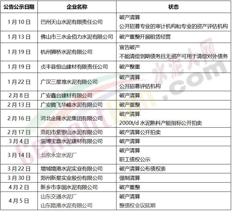 今年1~3月全國企業(yè)破產(chǎn)重整案件信息網(wǎng)公開發(fā)布了巴州天山水泥有限責(zé)任公司、佛山市三水金佰力水泥有限公司、杭州獅橋水泥有限公司、貞豐縣恒山建材有限責(zé)任公司、廣漢三星堆水泥有限公司、廣安鑫臺建材有限公司、廣安騰飛華峰水泥有限公司、河北金隆水泥集團有限公司、洛陽市紫羅山水泥有限公司、淄博寶鼎水泥建材有限公司、北京永定水泥廠、增城增港水泥實業(yè)有限公司、鄭州新星實業(yè)股份有限公司、新鄉(xiāng)市李固水泥有限公司、山東交通水泥廠、山東路港水泥有限公司等16家水泥企業(yè)相關(guān)的破產(chǎn)、破產(chǎn)重整、破產(chǎn)清算、強制破產(chǎn)消息。
