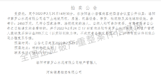 2月17日,洛陽市紫羅山水泥有限公司破產(chǎn)管理人聯(lián)合河南德惠拍賣有限公司發(fā)布拍賣公告稱,受委托定于2月25日公開拍賣洛陽市紫羅山水泥有限公司名下土地使用權(quán)、房屋、機器設(shè)備、存貨、構(gòu)筑物等,參考價為2450萬元。