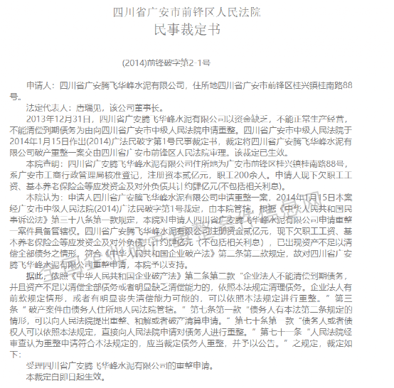2月13日四川省廣安市前鋒區(qū)人民法院裁定受理四川省廣安騰飛華峰水泥有限公司的破產(chǎn)重整申請。
