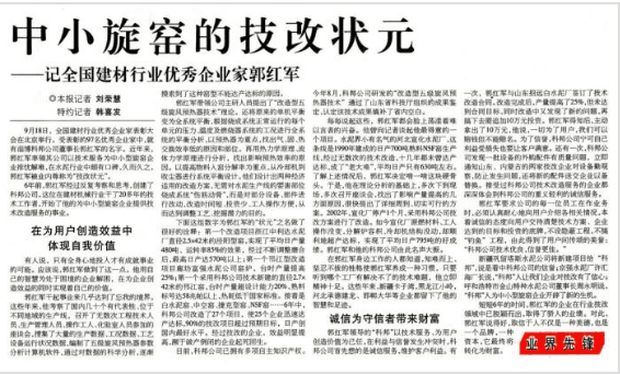 這在今天超產(chǎn)20%已經(jīng)成為常態(tài)的情況下,當(dāng)年就是一項奇跡;后來又繼續(xù)采用更先進(jìn)的“N-MFC”分解爐技術(shù)技術(shù),使這條生產(chǎn)線在仍然沒有擴(kuò)大預(yù)熱器規(guī)格,沒有更換高溫風(fēng)機(jī)的情況下,達(dá)到了1100t/d產(chǎn)量的生產(chǎn)能力。這些成績被中國建材報以“中小旋窯改造狀元”和”把成熟技術(shù)做到極致就是絕招“為題目分別做了詳細(xì)報道。并在國內(nèi)水泥行業(yè)再次掀起了中小型旋窯改造之風(fēng),當(dāng)時行業(yè)內(nèi)流傳著“旋窯改造都可干,想要更好找科邦”的說法。“科邦技術(shù)好,科邦的服務(wù)更好的”也成為當(dāng)時一些企業(yè)的共識;他們對大、中、小旋窯技改成績同時也得到了原國家建材局局長王燕某、副局長李儉之和中國水泥協(xié)會等領(lǐng)導(dǎo)的充分肯定。并親臨改造現(xiàn)場進(jìn)行考察。