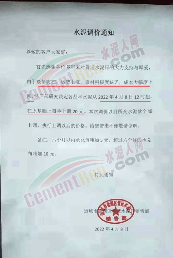 同日,山西運城多家水泥企業(yè)通知因新冠疫情影響,原材料供應緊張,價格持續(xù)上漲,致使水泥成本不斷上升,根據(jù)目前情況經(jīng)公司研究決定上調(diào)水泥價格。