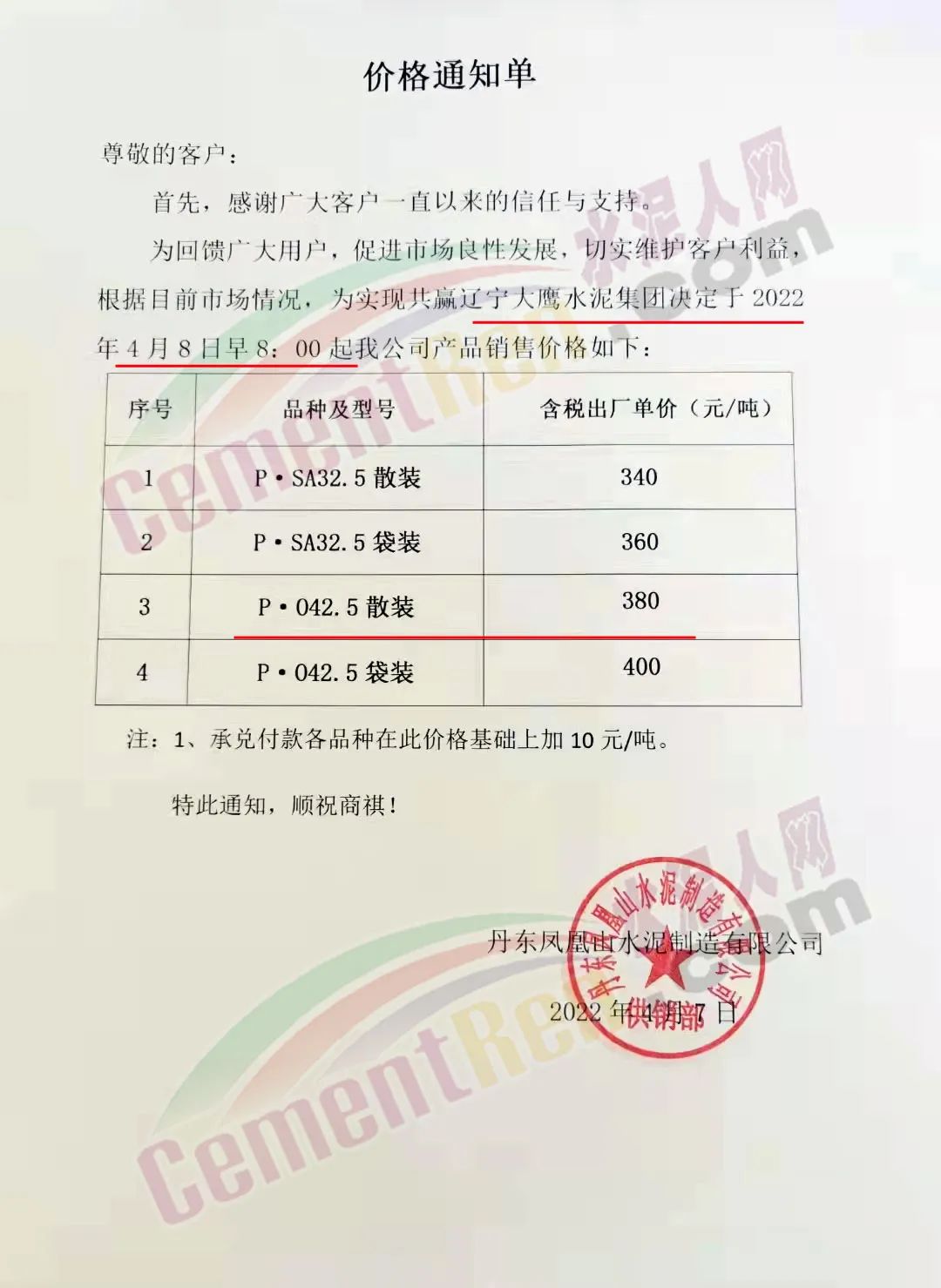 丹東鳳凰山水泥制造有限公司通知稱,根據(jù)目前市場情況,為實現(xiàn)共贏,遼寧大鷹水泥集團決定于4月8日早8時起公司產(chǎn)品銷售價格做調(diào)整 ,其中P.O42.5散裝水泥執(zhí)行380元/噸。承兌付款各品種在此價格基礎上加10元/噸。