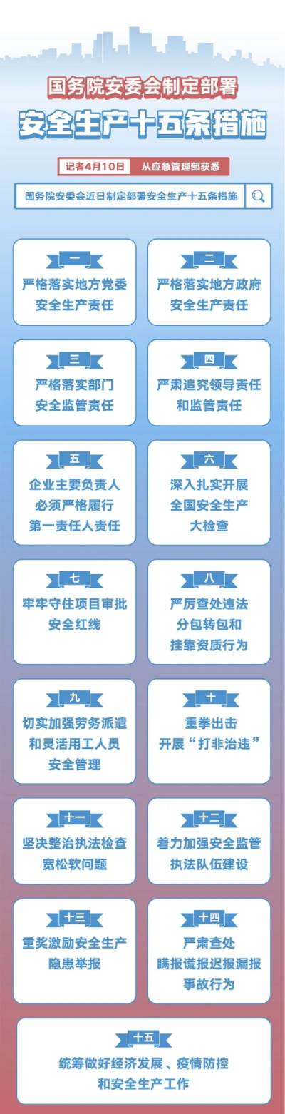 國(guó)務(wù)院安委辦有關(guān)負(fù)責(zé)人介紹,國(guó)務(wù)院安委會(huì)梳理相關(guān)法律法規(guī)已有規(guī)定、以往管用舉措和近年來針對(duì)新情況采取的有效措施,制定了進(jìn)一步強(qiáng)化安全生產(chǎn)責(zé)任落實(shí)、堅(jiān)決防范遏制重特大事故的十五條措施,部署發(fā)動(dòng)各方面力量全力抓好安全防范工作。
