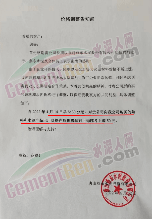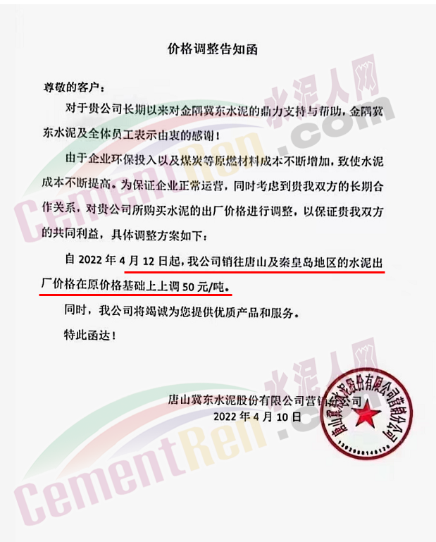 唐山冀東水泥股份有限公司唐山營銷分公司通知自4月12日起,公司銷往唐山及秦皇島地區(qū)地水泥出廠價(jià)在原價(jià)基礎(chǔ)上上調(diào)50元/噸。