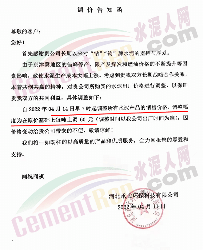 河北承大環(huán)保科技有限公司通知自4月14日早7時起,上調(diào)所有水泥產(chǎn)品的銷售價(jià)格60元/噸。