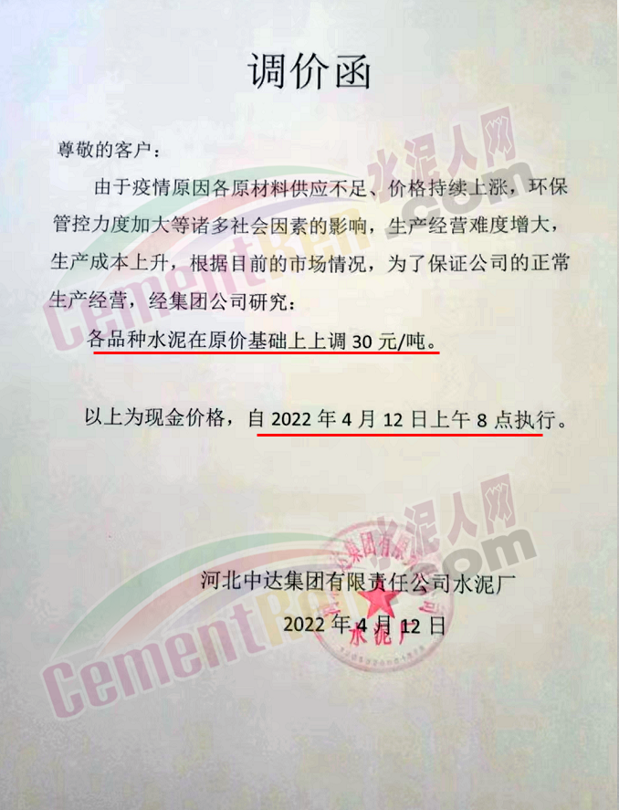 河北中達(dá)集團(tuán)有限責(zé)任公司水泥廠通知由于疫情原因各原材料供應(yīng)不足,價(jià)格持續(xù)上漲,環(huán)保管控力度加大等諸多因素影響,生產(chǎn)經(jīng)營難度增大,生產(chǎn)成本上升,為保證公司的正常生產(chǎn)經(jīng)營,各品種水泥自4月12日上午8時在原價(jià)基礎(chǔ)上上調(diào)30元/噸。