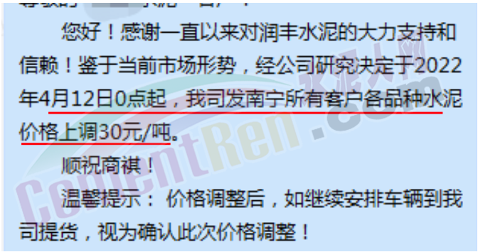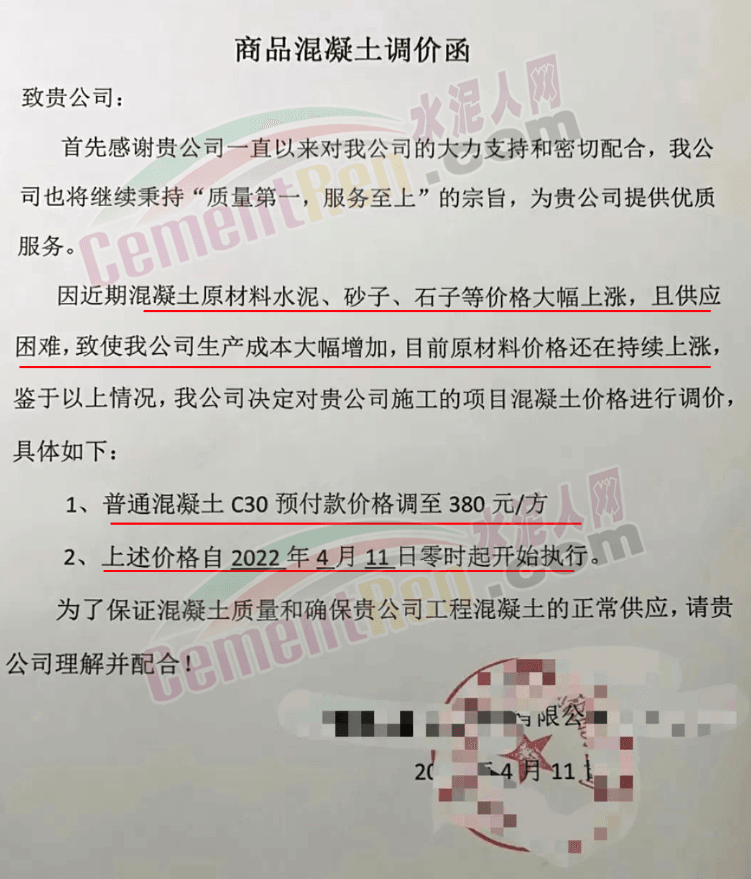 另一企業(yè)調(diào)價(jià)通知提到,原材料價(jià)格持續(xù)上漲,造成混凝土成本大幅上漲,公司通過內(nèi)部控制挖潛已經(jīng)無法克服原材料持續(xù)上漲帶來的成本壓力,為確保混凝土質(zhì)量,滿足供應(yīng),經(jīng)過多方面考慮,決定自4月12日起上調(diào)價(jià)格30元/立方。