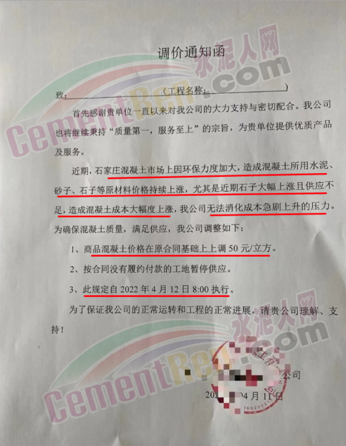 一企業(yè)通知函稱,近期石家莊混凝土市場上因環(huán)保力度加大,造成混凝土所用水泥、砂子、石子等原材料價(jià)格持續(xù)上漲,尤其是近期石子大幅上漲且供不應(yīng)求,造成混凝土成本大幅度上漲,公司無法消化成本急劇上升的壓力,為確?;炷临|(zhì)量,商品混凝土價(jià)格從4月12日8時起在原合同基礎(chǔ)上上調(diào)50元/立方。