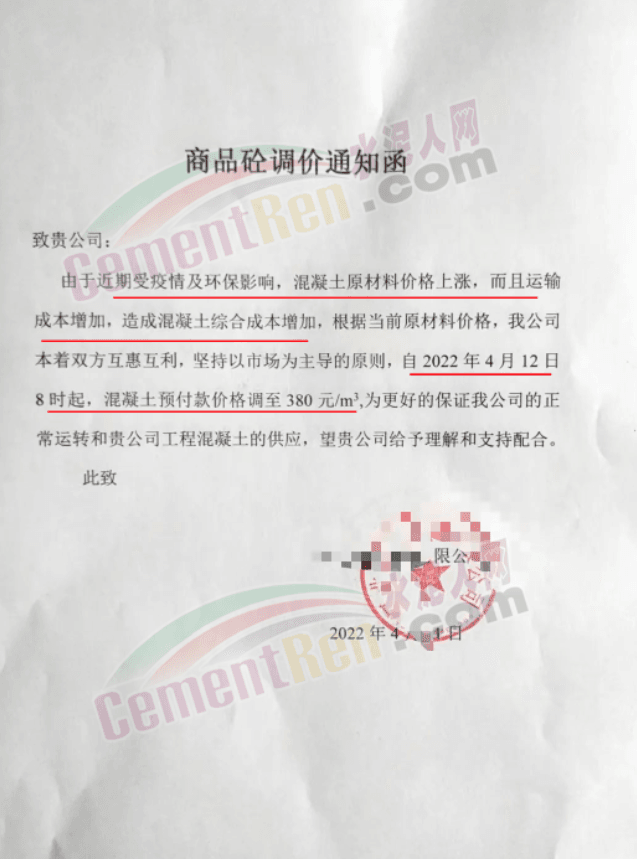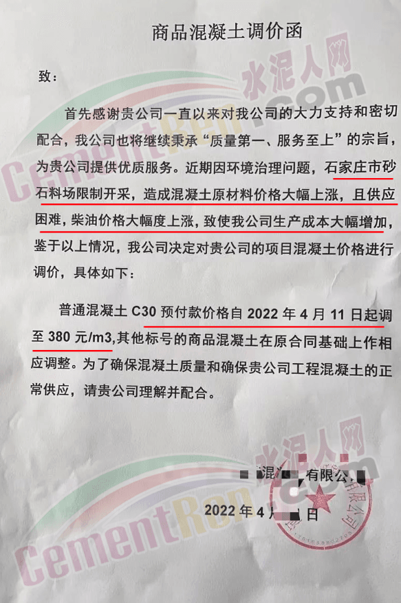 另一企業(yè)通知稱,近期因環(huán)境治理問題,石家莊市砂石料場限制開采,造成混凝土原材料價(jià)格大幅上漲,且供應(yīng)困難,柴油價(jià)格大幅度上漲,致使公司生產(chǎn)成本大幅增加,鑒于以上情況,公司決定自4月11日起普通混凝土C30預(yù)付款價(jià)格調(diào)至380元/立方。其他標(biāo)號的商品混凝土在原合同基礎(chǔ)上作相應(yīng)調(diào)整 。