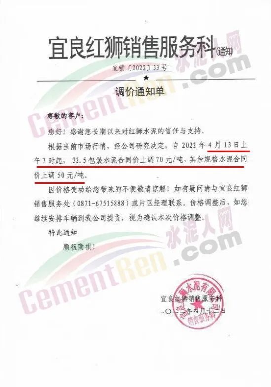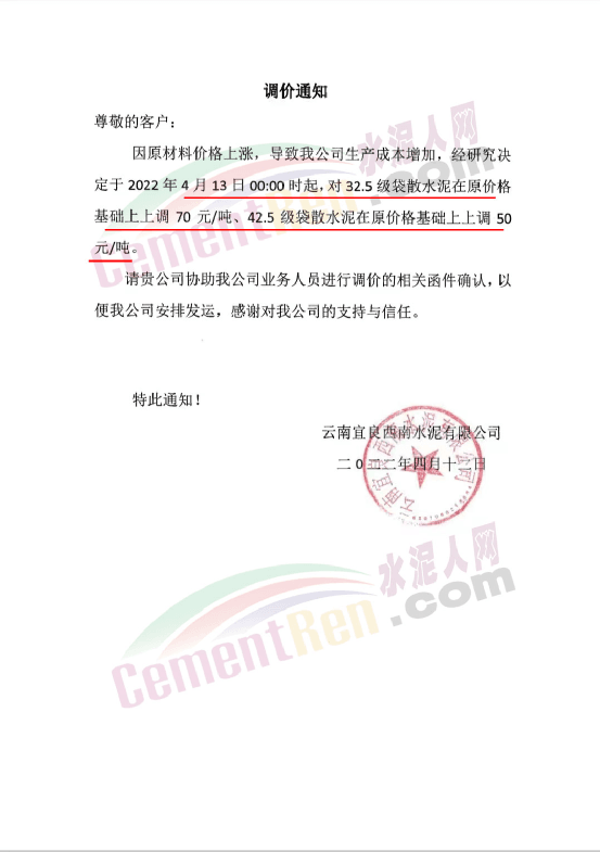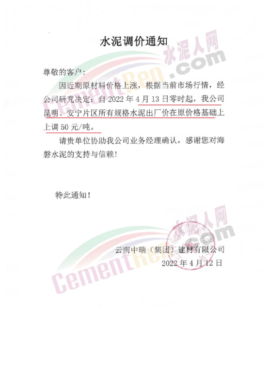 云南中瑞(集團)建材有限公司通知,4月13日0時起,昆明、安寧片區(qū)所有規(guī)格水泥出廠價上調(diào)50元/噸。