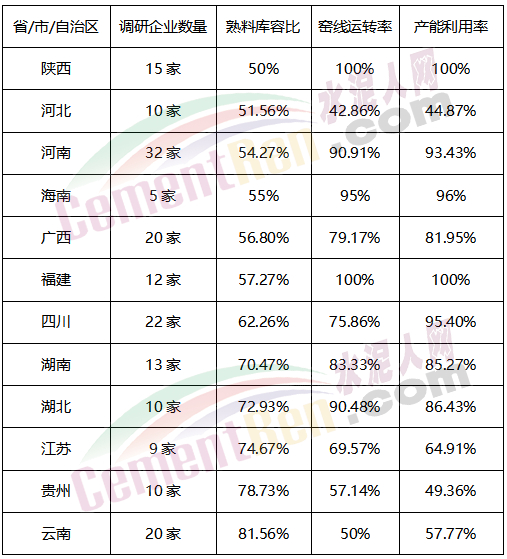 水泥人網(wǎng)信息中心陜西、河北、河南、廣西、福建、四川、湖南、江蘇、貴州、云南等10多個(gè)地區(qū)水泥企業(yè)調(diào)研數(shù)據(jù)顯示近期各區(qū)域熟料庫(kù)容比均達(dá)到50%及以上,云南區(qū)域20家企業(yè)熟料庫(kù)容比達(dá)到81.56%,窯線運(yùn)轉(zhuǎn)率僅50%左右。四川、湖北、貴州、云南、湖南等多地產(chǎn)能利用率均有不同幅度下降。