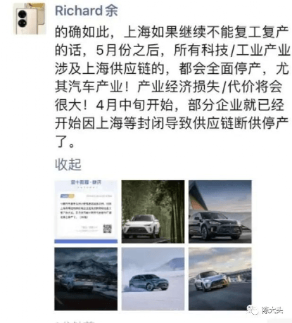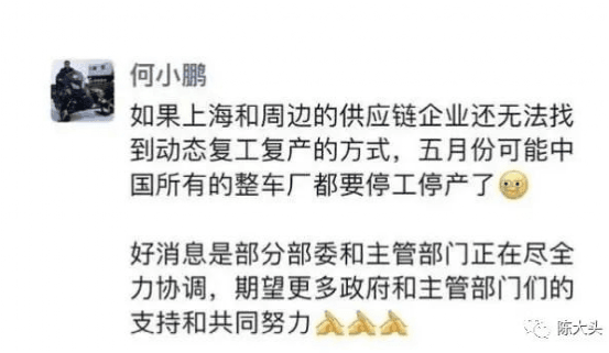 小鵬汽車董事長何小鵬在朋友圈發(fā)文稱,如果上海和周邊的供應鏈企業(yè)還無法找到動態(tài)復工復產的方式,五月份可能中國所有的整車廠都要停工停產了。