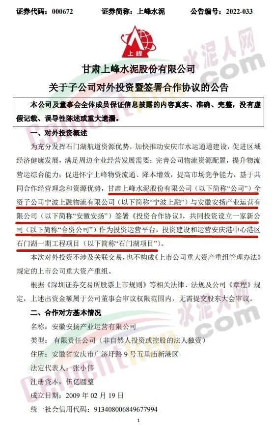 日前,上峰水泥發(fā)布公告,為充分發(fā)揮石門湖航道資源優(yōu)勢(shì),加快推動(dòng)安慶市水運(yùn)通道建設(shè),促進(jìn)區(qū)域經(jīng)濟(jì)健康發(fā)展,滿足周邊企業(yè)經(jīng)營(yíng)發(fā)展需要;完善公司物流資源配置,提升物流營(yíng)運(yùn)綜合能力;促進(jìn)懷寧上峰物資流通、降本增效,提高市場(chǎng)競(jìng)爭(zhēng)能力,基于共同合作經(jīng)營(yíng)理念和資源優(yōu)勢(shì),公司全資子公司寧波上融物流有限公司與安徽安揚(yáng)產(chǎn)業(yè)運(yùn)營(yíng)有限公司簽署《投資合作協(xié)議》,共同投資設(shè)立一家新公司作為投資運(yùn)營(yíng)平臺(tái),投資建設(shè)和運(yùn)營(yíng)安慶港中心港區(qū)石門湖一期工程項(xiàng)目。