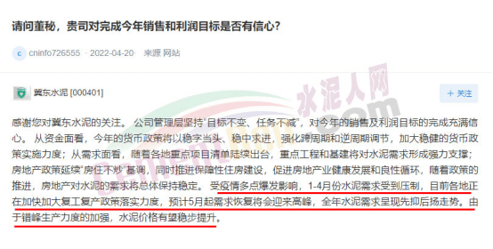 冀東水泥回復(fù):公司管理層堅(jiān)持“目標(biāo)不變、任務(wù)不減”,對今年的銷售及利潤目標(biāo)的完成充滿信心。