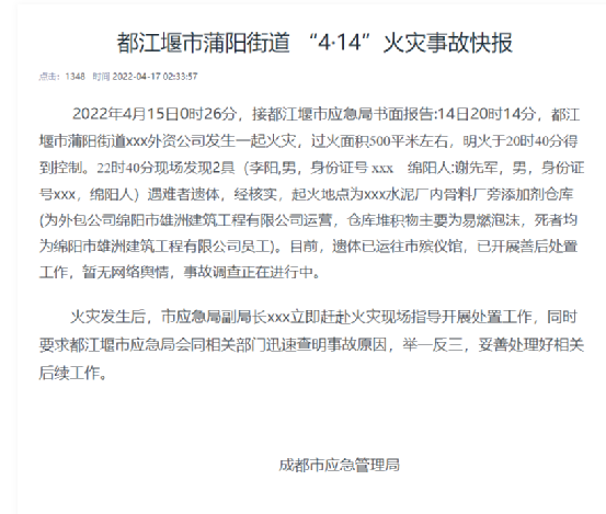 經(jīng)核實(shí),起火地點(diǎn)為水泥廠內(nèi)骨料廠旁添加劑倉(cāng)庫(kù)(為外包公司綿陽(yáng)市雄洲建筑工程有限公司運(yùn)營(yíng),倉(cāng)庫(kù)堆積物主要為易燃泡沫,死者均為綿陽(yáng)市雄洲建筑工程有限公司員工)。遺體已運(yùn)往市殯儀館,已開(kāi)展善后處置工作,事故調(diào)查正在進(jìn)行中。