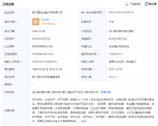據(jù)工商注冊(cè)信息顯示,都江堰拉法基水泥有限公司成立于1999年02月09日,注冊(cè)地位于四川省成都市都江堰市四川都江堰經(jīng)濟(jì)開(kāi)發(fā)區(qū)九鼎大道21號(hào),法定代表人為孫華鴻。