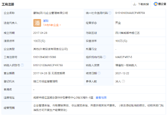 股東信息顯示,其大股東為豪瑞(四川)企業(yè)管理有限公司,持股比例為74.9962%。