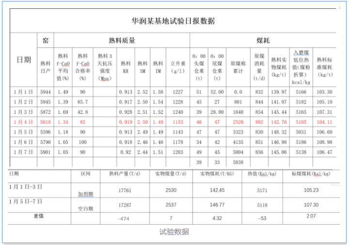 于是,福建朝旭與華潤某基地雙方負(fù)責(zé)人進(jìn)行了深入的技術(shù)交流,決定在其基地的5000t/d生產(chǎn)線開展使用ZX-014節(jié)煤劑節(jié)煤效果測試。通過在生料配方穩(wěn)定的情況下進(jìn)行了噸熟料實(shí)物煤耗、噸熟料標(biāo)準(zhǔn)煤耗,以及添加燃煤催化劑后的噸熟料實(shí)物煤耗、噸熟料標(biāo)準(zhǔn)煤耗的變化測試。測試結(jié)果顯示,ZX-014節(jié)煤劑在提升水泥企業(yè)能效,降低生產(chǎn)煤耗方面作用明顯。為后期集團(tuán)其他生產(chǎn)基地節(jié)能降耗減碳新思路、新材料、新方法提供依據(jù)。