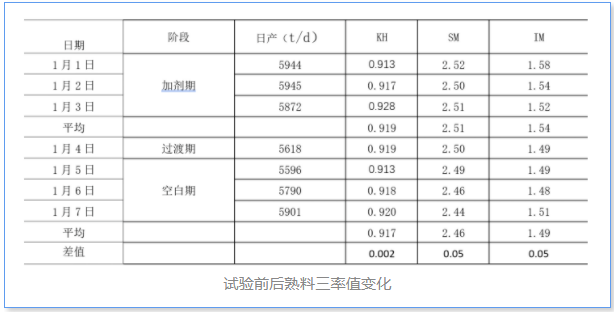 以上數(shù)據(jù)對比發(fā)現(xiàn)摻加試劑后,熟料三率值均有不同,噸熟料實(shí)物煤耗下降了4.32kg/t,噸熟料標(biāo)煤耗降低2.07kg/t。