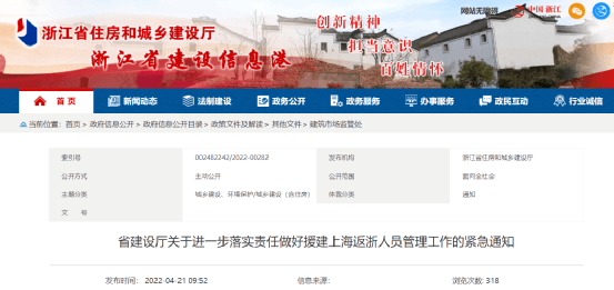 2022年4月19日浙江省住房和城鄉(xiāng)建設(shè)廳發(fā)布《關(guān)于進(jìn)一步落實(shí)責(zé)任做好援建上海返浙人員管理工作的緊急通知》提到,近期,在調(diào)研督查中發(fā)現(xiàn),部分地市、單位還存在認(rèn)識(shí)欠到位,一些企業(yè)管控主體責(zé)任還未落實(shí),“四方責(zé)任”鏈條還未能全部貫通。為貫徹落實(shí)省委、省政府疫情防控決策部署,進(jìn)一步落實(shí)責(zé)任做好援建上海返浙人員管理工作,發(fā)出緊急通知。
