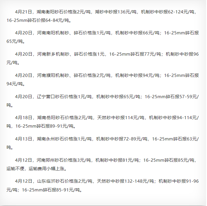 混凝土方面,跟隨水泥漲價(jià)同步推漲。4月21日,云南普洱混凝土價(jià)格漲10元/方;4月19日,云南麗江混凝土價(jià)格漲20元/方;4月18日,廣東云浮混凝土價(jià)格漲20元/方;4月12日,石家莊混凝土價(jià)格漲30元/方……