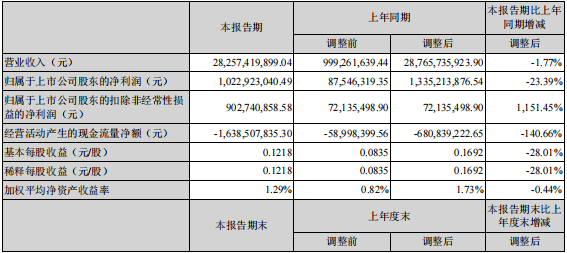 4月25日,新疆天山水泥股份有限公司發(fā)布2022年第一季度業(yè)績報告稱,公司第一季度實現(xiàn)營業(yè)收入28,257,419,899.04 元,同比下降1.77%;歸屬于上市公司股東的凈利潤1,022,923,040.49元,同比下降23.39%。