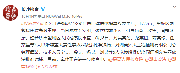 據(jù)湖南省長沙市人民檢察院官方微博消息,長沙居民自建房倒塌事故發(fā)生后,長沙市、望城區(qū)兩級檢察院高度重視,當日成立專案組,依法提前介入,引導偵查,收集、固定證據(jù)。