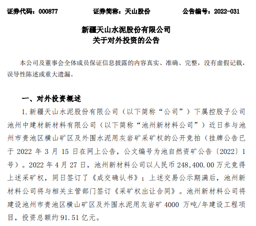 日前,天山股份發(fā)布公告稱,子公司池州新材料公司成功競得貴池區(qū)橫山礦區(qū)及外圍水泥用灰?guī)r礦采礦權(quán),并將投資91.51億元建設(shè)水泥用灰?guī)r礦4000萬噸/年建設(shè)工程項(xiàng)目。池州新材料公司建設(shè)項(xiàng)目內(nèi)容為“年產(chǎn)4000萬噸礦產(chǎn)品加工生產(chǎn)線及配套礦產(chǎn)品運(yùn)輸廊道”。此將投資將進(jìn)一步發(fā)展骨料業(yè)務(wù),優(yōu)化公司沿長江經(jīng)濟(jì)帶投資布局,促進(jìn)長三角核心區(qū)建設(shè)。
