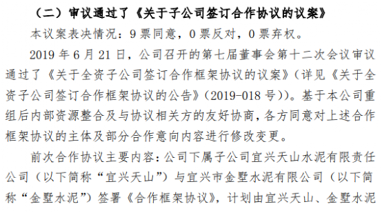 其一為公司下屬子公司宜興天山、江蘇新街南方水泥有限公司、上海南方水泥有限公司(簡稱“上海南方”)與金墅水泥、江蘇晟宇房地產(chǎn)開發(fā)有限公司簽署《優(yōu)化升級項(xiàng)目合作協(xié)議》。由上海南方與金墅水泥、晟宇公司成立合資公司,合資公司由上海南方持股 50.5%、金墅水泥持股 44.5%、晟宇公司持股占 5%;并以合資公司為主體按市場化原則購買產(chǎn)能指標(biāo),減量置換建設(shè)一條 7500t/d 新型干法水泥熟料生產(chǎn)線,配套建設(shè) 300 萬噸水泥粉磨,并擇機(jī)適時(shí)建設(shè)水泥窯協(xié)同處置項(xiàng)目。