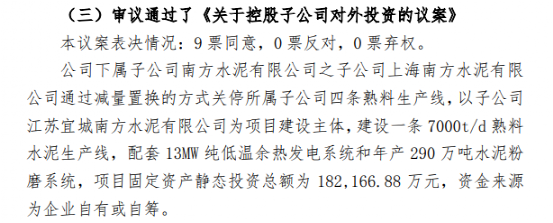 其二為公司下屬子公司南方水泥有限公司之子公司上海南方水泥有限公司通過減量置換的方式關(guān)停所屬子公司四條熟料生產(chǎn)線,以子公司江蘇宜城南方水泥有限公司為項(xiàng)目建設(shè)主體,建設(shè)一條 7000t/d 熟料水泥生產(chǎn)線,配套 13MW 純低溫余熱發(fā)電系統(tǒng)和年產(chǎn) 290 萬噸水泥粉磨系統(tǒng),項(xiàng)目固定資產(chǎn)靜態(tài)投資總額為 18.22億,資金來源為企業(yè)自有或自籌。