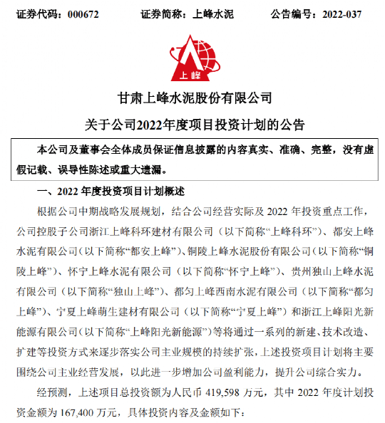 4月26日晚間,甘肅上峰水泥股份有限公司發(fā)布《關(guān)于公司2022年度項(xiàng)目投資計(jì)劃的公告》稱,根據(jù)公司中期戰(zhàn)略發(fā)展規(guī)劃,結(jié)合公司經(jīng)營實(shí)際及 2022 年投資重點(diǎn)工作,公司控股子公司浙江上峰科環(huán)建材有限公司、都安上峰水泥有限公司、銅陵上峰水泥股份有限公司、懷寧上峰水泥有限公司、貴州獨(dú)山上峰水泥有限公司、都勻上峰西南水泥有限公司、寧夏上峰萌生建材有限公司和浙江上峰陽光新能源有限公司等將通過一系列的新建、技術(shù)改造、 擴(kuò)建等投資方式來逐步落實(shí)公司主業(yè)規(guī)模的持續(xù)擴(kuò)張,上述投資項(xiàng)目計(jì)劃將主要圍繞公司主業(yè)經(jīng)營發(fā)展,以此進(jìn)一步增加公司盈利能力,提升公司綜合實(shí)力。經(jīng)預(yù)測,上述項(xiàng)目總投資額為人民幣419,598萬元,其中2022年度計(jì)劃投資金額為167,400 萬元。