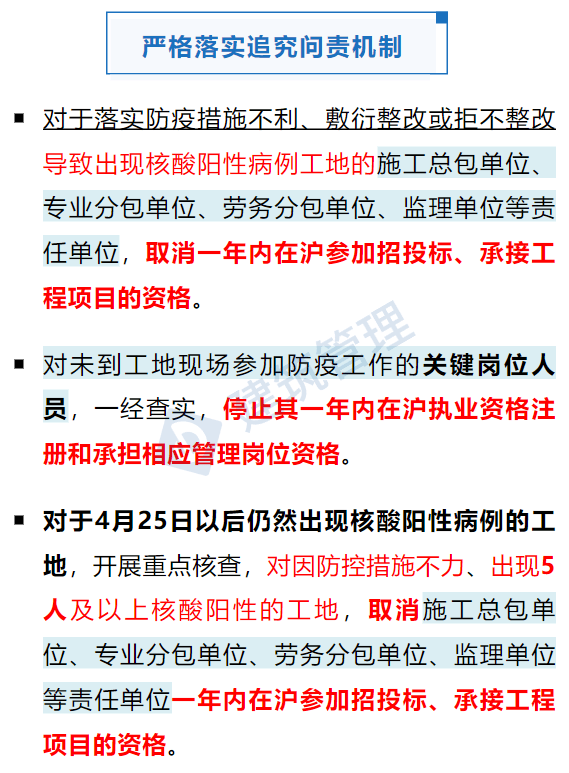 對(duì)于4月25日以后仍然出現(xiàn)核酸陽(yáng)性病例的工地,開(kāi)展重點(diǎn)核查,對(duì)因防控措施不力、出現(xiàn)5人及以上核酸陽(yáng)性的工地,取消施工總包單位、專業(yè)分包單位、勞務(wù)分包單位、監(jiān)理單位等責(zé)任單位一年內(nèi)在滬參加招投標(biāo)、承接工程項(xiàng)目的資格。對(duì)于方艙醫(yī)院(或臨時(shí)隔離用房)項(xiàng)目回流人員處置不力、管理不善導(dǎo)致工地內(nèi)疫情蔓延的相關(guān)單位,參照上述條款處罰。