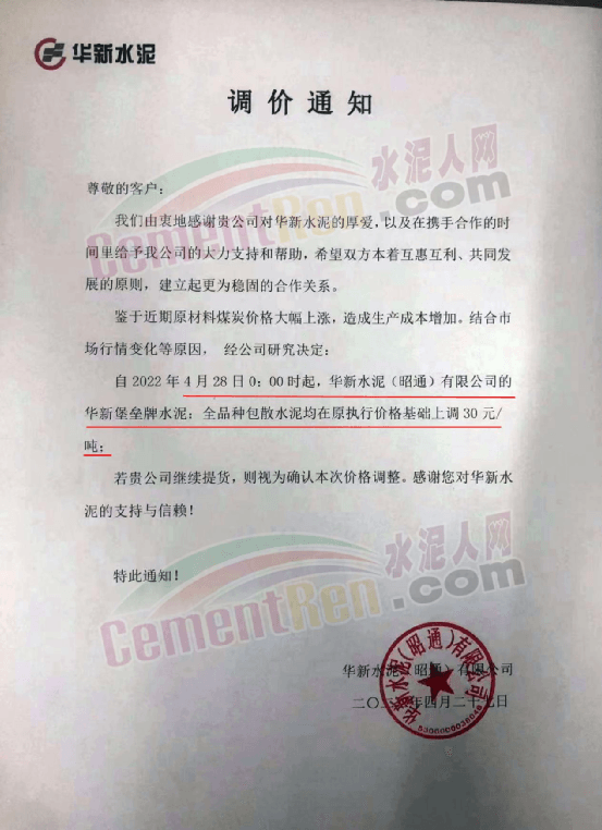 華新水泥(昭通)有限公司通知鑒于近期原材料煤炭價(jià)格大幅上漲,造成生產(chǎn)成本增加。結(jié)合市場行情變化等原因,經(jīng)公司研究決定自年4月28日0時(shí)起,華新堡壘牌水泥全品種包散水泥均在原執(zhí)行價(jià)格基礎(chǔ)上調(diào)30元/噸。