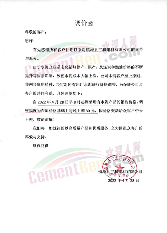 鎮(zhèn)雄縣三和建材有限公司通知由于水泥企業(yè)常態(tài)化錯(cuò)峰停產(chǎn)、限產(chǎn),及煤炭和燃油價(jià)格的不斷提升等因素影響,致使水泥成本大幅上漲。公司本著客戶至上原則,共創(chuàng)共贏的精神,決定對所有出廠水泥進(jìn)行價(jià)格調(diào)整,為保證公司與客戶的共同利益,自4月28日早8時(shí)起調(diào)整所有水泥產(chǎn)品的銷售價(jià)格,調(diào)整幅度為在原價(jià)格基礎(chǔ)上上調(diào)30元/噸。