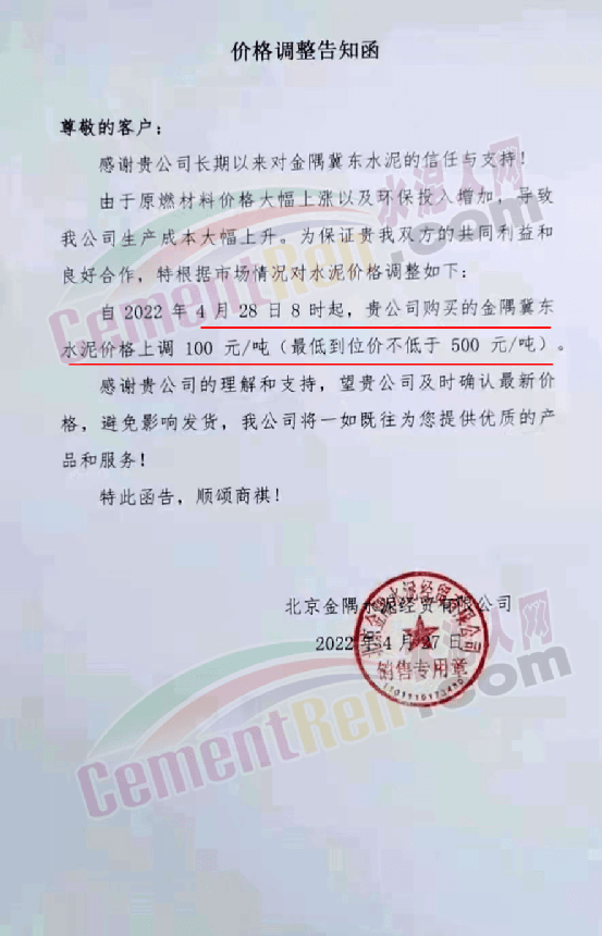 云南永保特種水泥有限責(zé)任公司通知,因各類水泥原材料的緊缺及價(jià)格上漲而導(dǎo)致生產(chǎn)成本的上升,故對水泥價(jià)格做出調(diào)整以緩解不斷上漲的成本壓力,自2022年4月30日0時(shí)起所有區(qū)域所有品種水泥在原價(jià)基礎(chǔ)上上調(diào) 30元/噸。