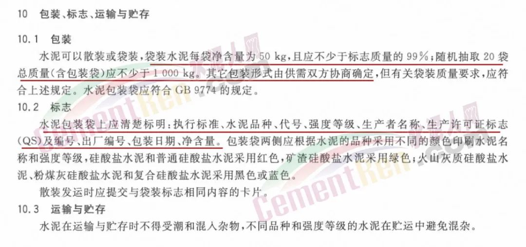 普通硅酸鹽水泥標(biāo)準(zhǔn)GB175-2007第10節(jié)明確,水泥可以散裝或袋裝,袋裝水泥每袋凈含量50kg,且應(yīng)不少于標(biāo)準(zhǔn)質(zhì)量的99%;隨機(jī)抽取20袋總質(zhì)量(含包裝袋)應(yīng)不少于1000kg。其它包裝形式由供需雙方協(xié)商確定,但有關(guān)袋裝質(zhì)量要求,應(yīng)會(huì)使上述規(guī)定。水泥包裝袋應(yīng)符合GB9774的規(guī)定。