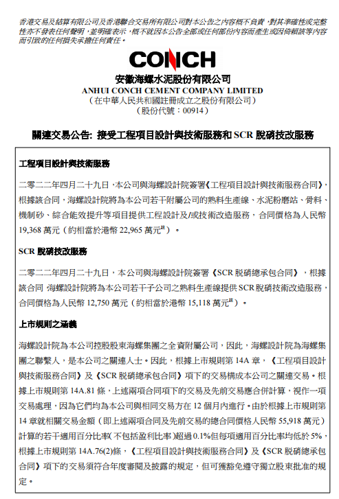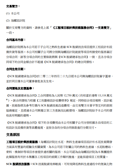 SCR脫硝技改服務,2022年4月29日,本公司與海螺設計院簽署《SCR脫硝總承包合同》,根據(jù)該合同,海螺設計院將為本公司若干子公司之熟料生產線提供SCR脫硝技術改造服務,注合同價格為人民幣12,750萬元(約相當于港幣15,118萬元)。