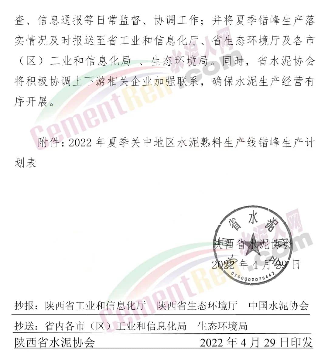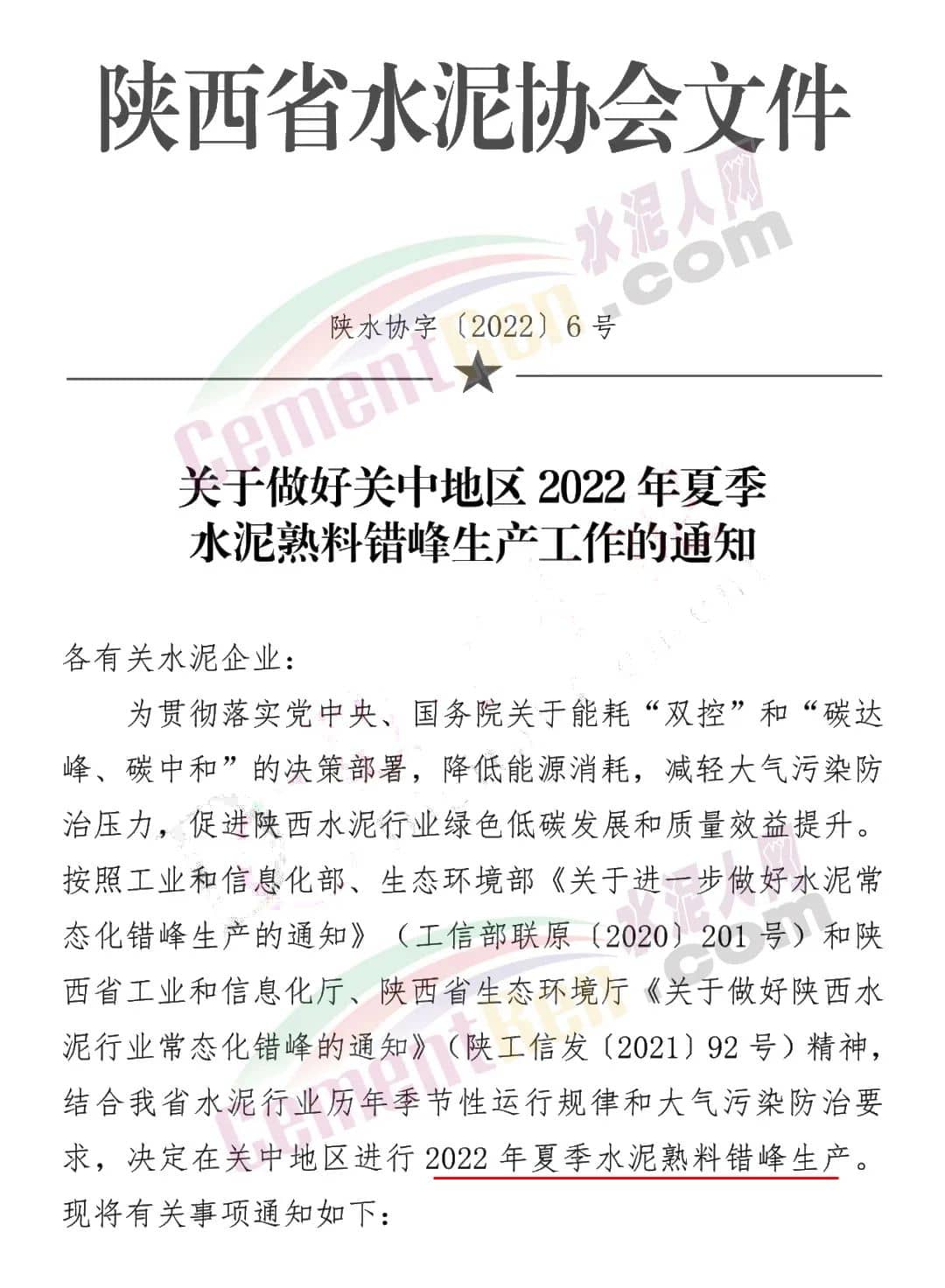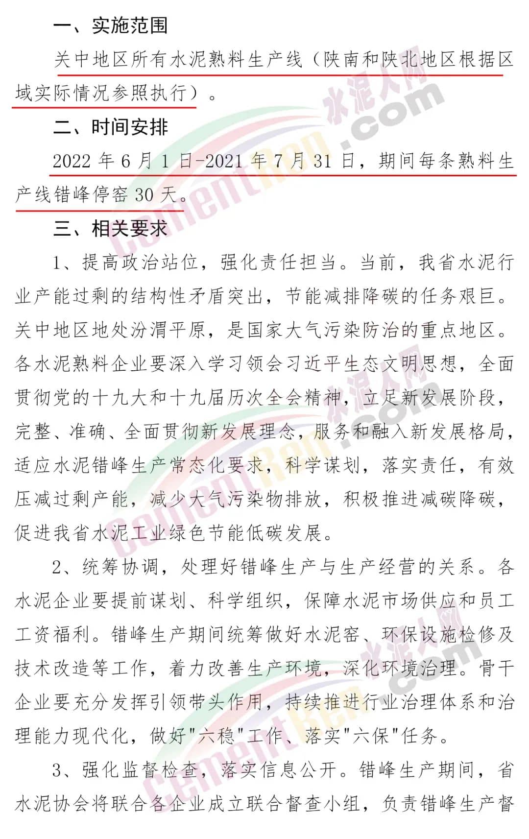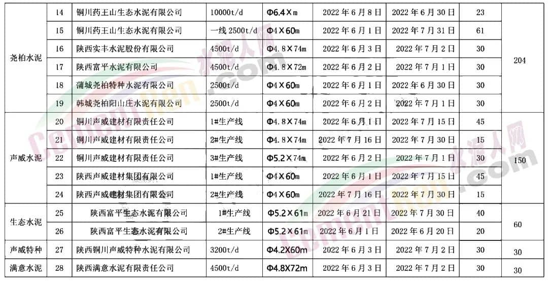 4月29日,陜西省水泥協(xié)會發(fā)布關于做好關中地區(qū)2022年夏季水泥熟料錯峰生產工作的通知,要求關中地區(qū)所有水泥熟料生產線于2022年6月1日至7月31日期間錯峰停窯30天/線。 水泥人網注意到,陜西關中海螺水泥、冀東水泥、堯柏水泥、聲威水泥、生態(tài)水泥、聲威特種、滿意水泥等7家水泥企業(yè),最長停窯210天,28條生產線合計共停窯864天;銅川兩條萬噸線分別于6月8日和6月2日開始停窯限產,堯柏水泥萬噸線將于6月8日至6月30日期間停產23天。冀東水泥萬噸線于6月2日至7月1日期間停產30天。