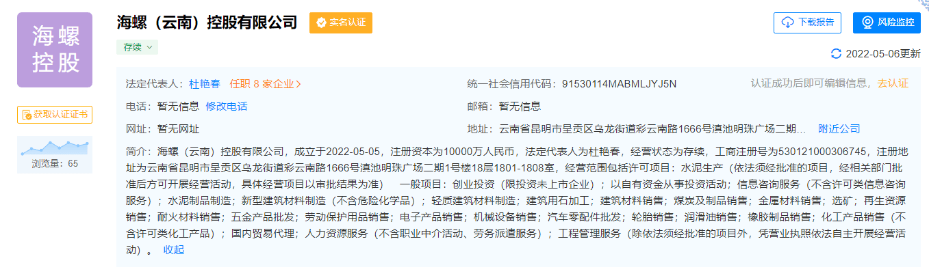 天眼查數(shù)據(jù)顯示,海螺(云南)控股有限公司成立于2022年5月5日,注冊資本1億元,法人代表為杜艷春,經(jīng)營范圍包括:水泥生產(chǎn);創(chuàng)業(yè)投資(限投資未上市企業(yè));以自有資金從事投資活動;信息咨詢服務(不含許可類信息咨詢服務)等。目前,其由海螺水泥100%持股。